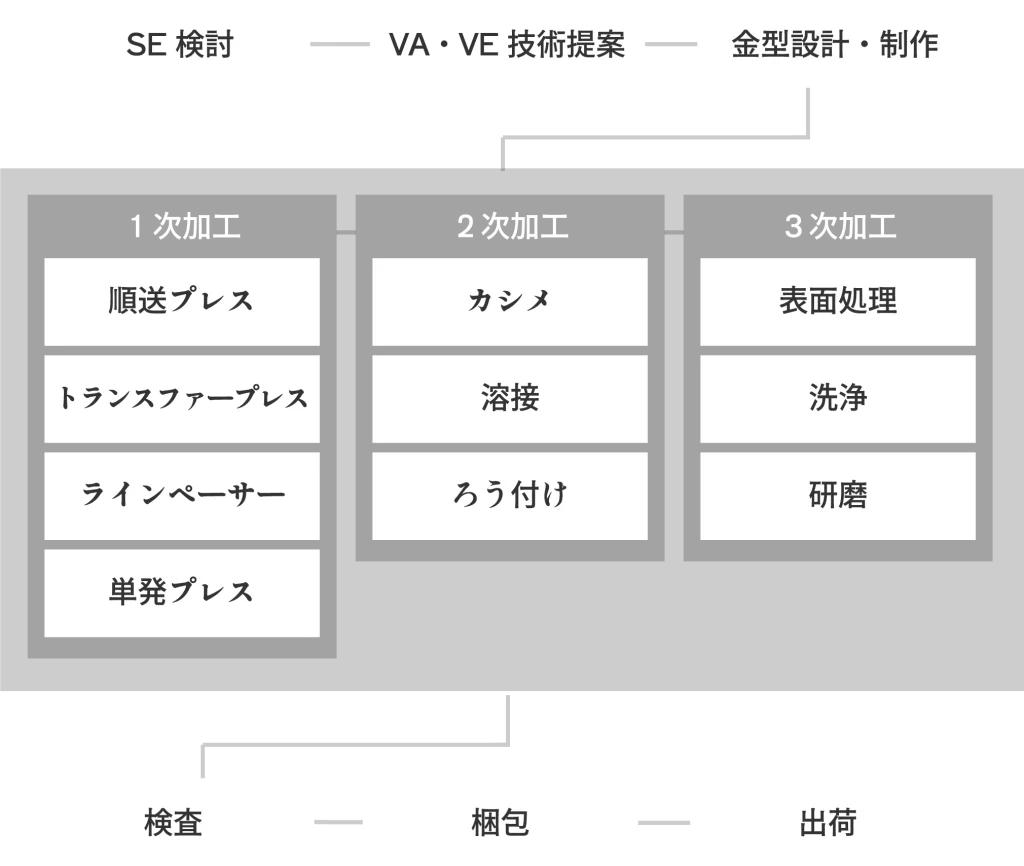 プレス金型製作は、高度な技術力を要するプロセスです。当社は、専門性を持つパートナーと連携し、共同でSE検討を行うことで、製作工程を効率化し、品質を向上させています。